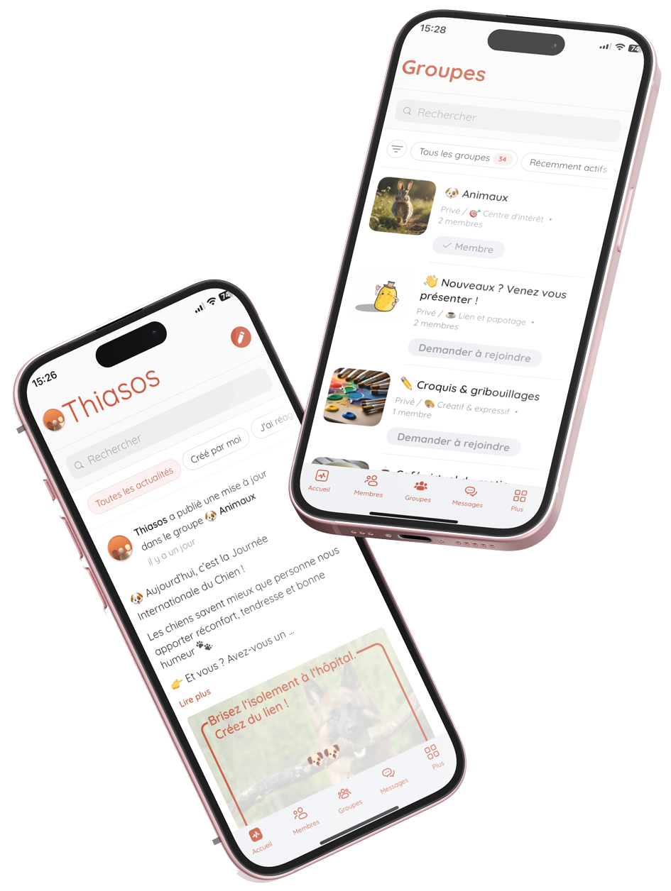 Thiasos est un réseau social conçu pour les patients hospitalisés. Il permet de créer du lien avec d’autres patients partageant les mêmes  centres d’intérêt. Son objectif est de rompre l’isolement et favoriser l’entraide au sein d’une communauté bienveillante.